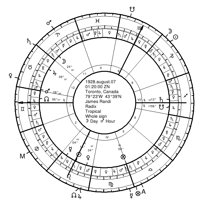 As profections is one of my favorite predictive methods, I was happy to see that you have covered this subject too. I read what you wrote about James Randi and the profections at the time of his announcement of the diagnosis of his cancer. It was a great delineation – but unfortunately you have arrived at the wrong house. You wrote that Randi was 70 in 2008, but in fact he was 80, having been born in 1928. This means that the profected Ascendant was in the 9th place, which is Aquarius, and the Lord of the Year was Saturn. At the time of the announcement, the profected month was the 7th place, where Randi’s natal Saturn is situated, so activating it. I see that you use precessed Solar returns, but as I myself use non-precessed returns, I also noticed that at the time of the announcement, transiting Saturn had arrived at the Solar return Ascendant exactly.