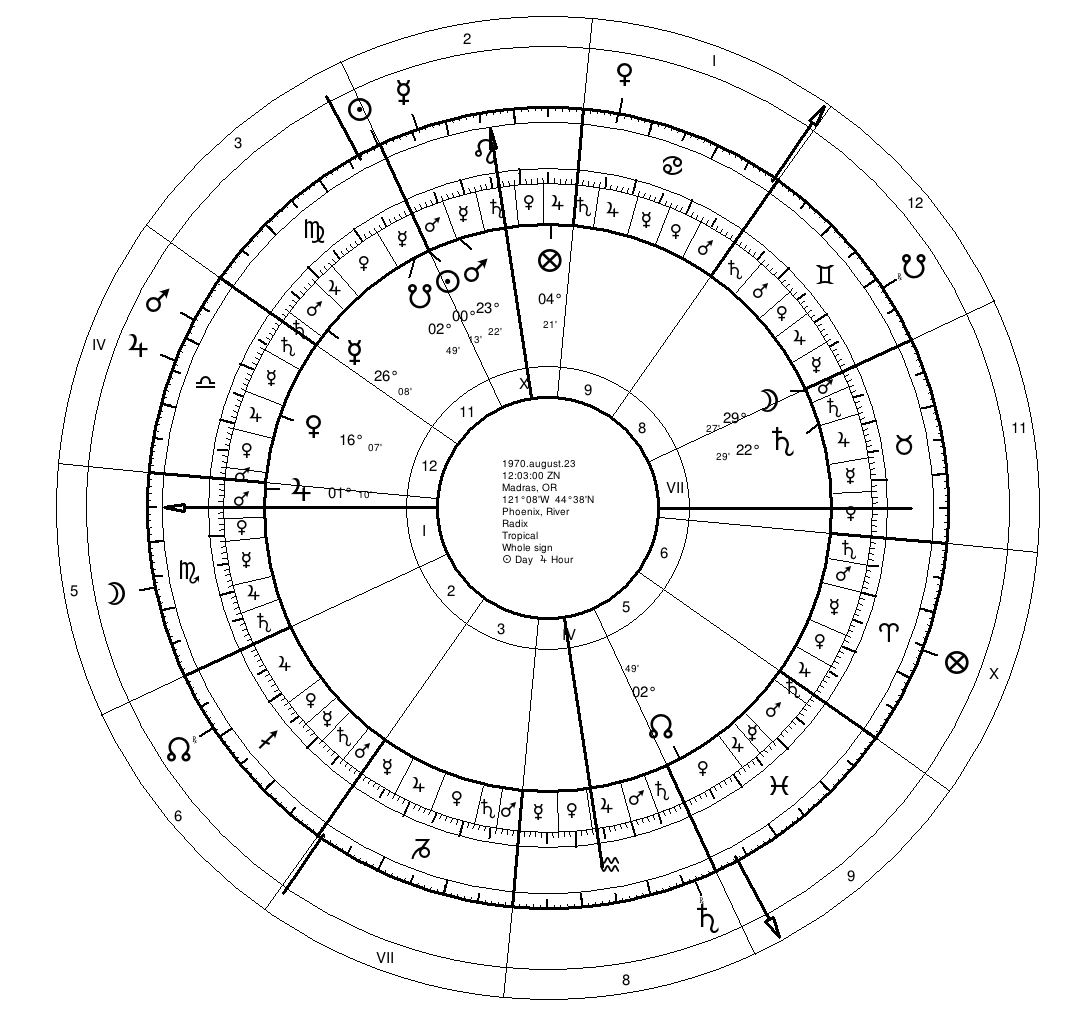 Vettius Valens emphasized the role played by the prenatal syzygy in matters related to health. The prenatal syzygy is the New or Full Moon which most directly preceded the birth. River Phoenix was born with a waning Moon so prior to birth there was a Full Moon. The Full Moon preceding his birth was at 23°48′ Aquarius. Note that it is in partile (same-degree) opposition with natal Mars and is in a tight square with natal Saturn. The transiting Mars-Saturn configuration noted above brings in the prenatal syzygy.
