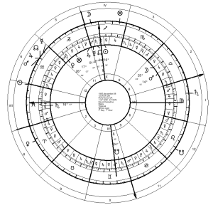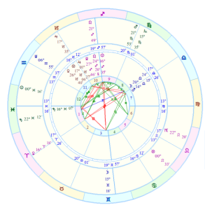 In Kurt Cobain’s natal chart, the Sun, which moves about a degree a day, is about 27° behind Saturn.  Kurt died at Age 27. As we can see from the chart of the secondary progression, he died when the Sun progressed to Saturn. In other words, the Sun conjoined Saturn 27 days after he was born which is symbolic of Age 27.  In the chart for 27 days after birth, the Sun is at 28°49′ of Pisces, which is in the same degree as his natal Saturn. The disc of the Sun (half a degree wide) actually spans over that exact Saturn position.