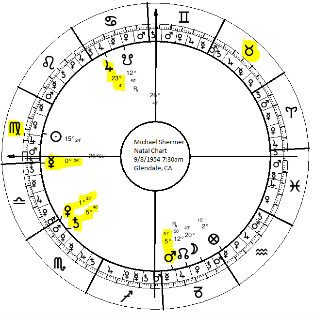 Jupiter is strong in Shermer’s chart. Jupiter is advancing, in a sign of a light (Cancer), and regarded by both Lights. It is also receiving the application of its ruler, the Moon. When Jupiter is generally strong in this way, we might suppose that among other Jupiter significations being prominent in the life. For instance, we may suppose that the native has had many expansive spiritual experiences that transcended the known.