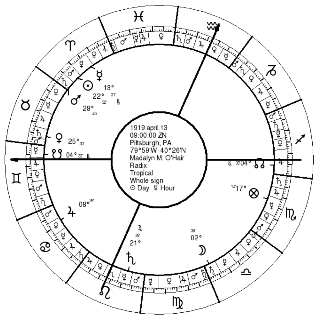 For an atheist, we find Jupiter unusually strong and mixed.  The 2nd Place was included in the bad places in Hellenistic astrology. The 2nd doesn’t regard the 1st. The 6th, 12th, 8th, and 2nd don’t regard the 1st and therefore were considered “dark” or “bad”.  However, in many ways the 2nd is the least bad of those houses. It may be the case that O’Hair’s atheism was a development in life brought on by Mars dominating Jupiter. This is a common configuration for evangelizing but can similarly pertain to aggression, contention, and competition when it comes to belief.  She was known to purposely try to offend people that disagreed with her. Additionally, she disowned her own son for becoming a preacher (Moon in V applies to and is dominated by Jupiter but is opposite Mars; Jupiter’s twelfth-part is in V).