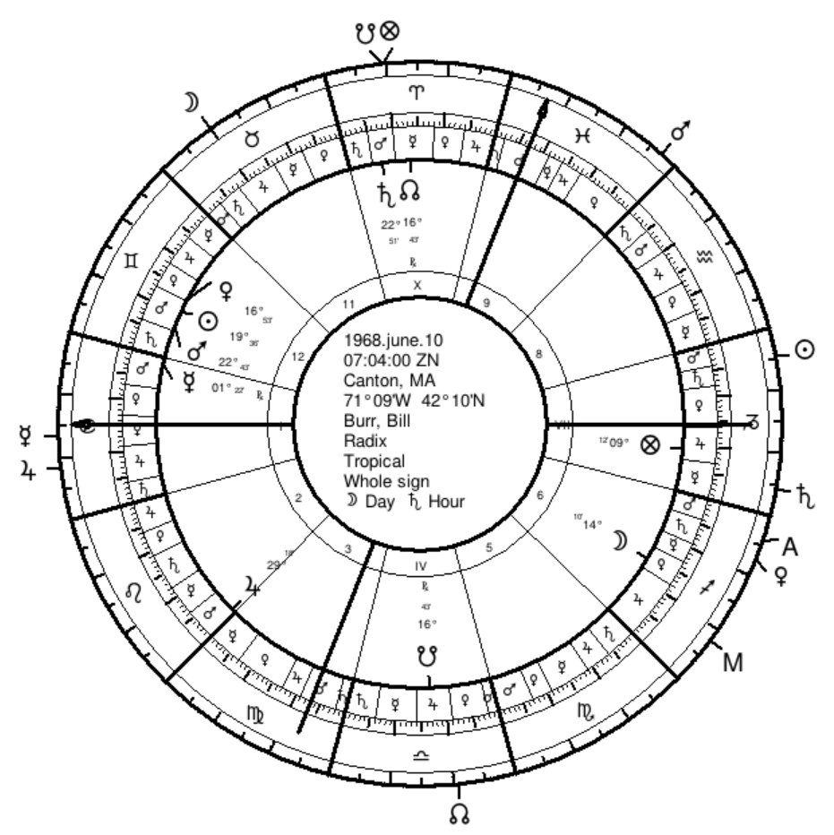 Bill Burr (birth time AA-rated) was also born with Mercury in the 1st house of self. Mercury is the professional significator as Venus and Mars are in the 12th house. Mercury is in the 1st while its twelfth-part and that of Jupiter are also in the 1st house. Jupiter is the exalted ruler of the rising sign. Therefore, Mercury and Jupiter connect with each other, the identity, and the profession through the rising sign.