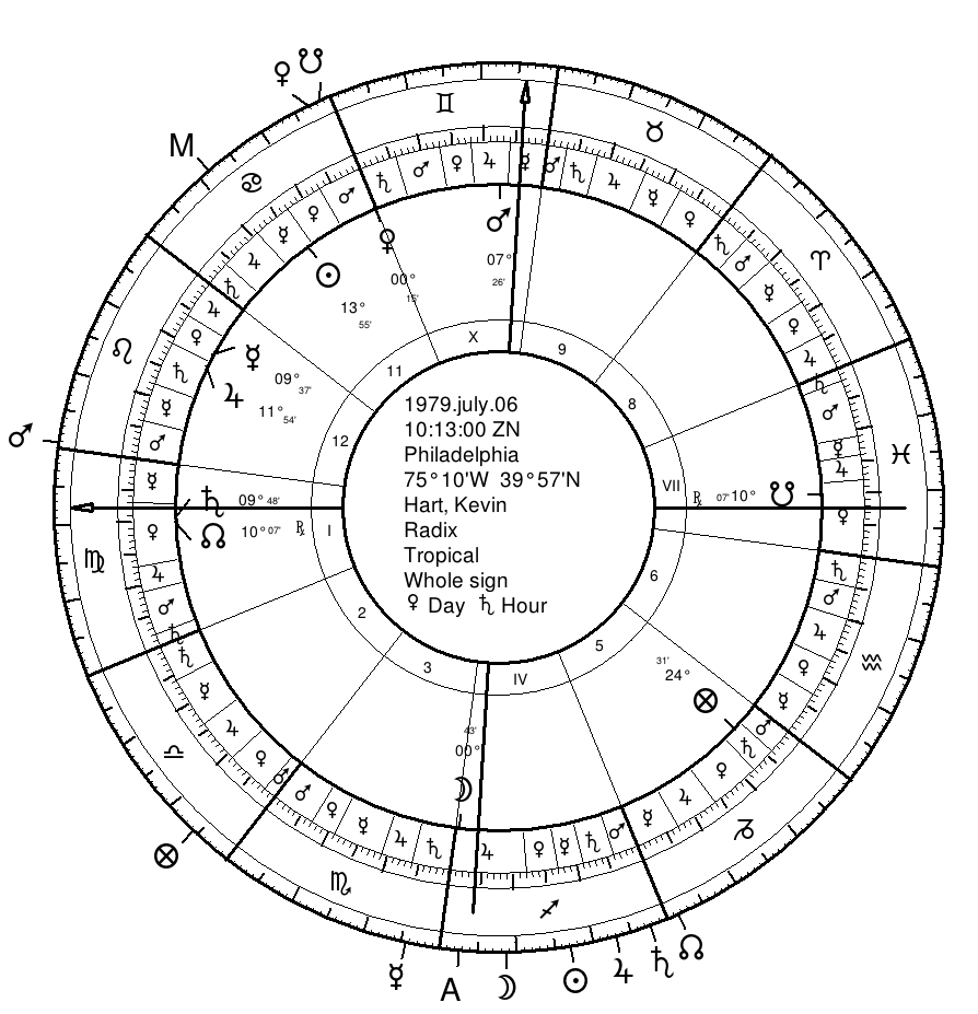 Kevin Hart has Jupiter in sect but in the 12th house (bad place) and overcome by Mars (out of sect malefic).