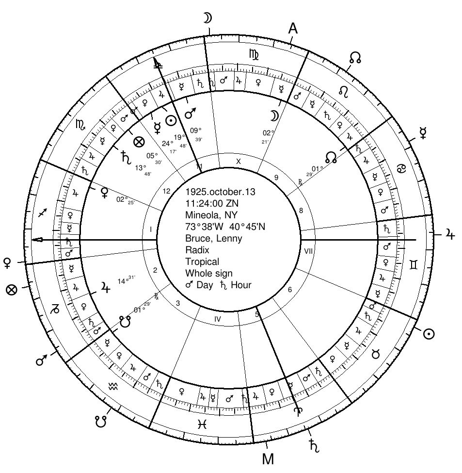 Identification with Jupiter is strong. Jupiter rules the Ascendant and the bound of the 1st house Venus. Additionally, Jupiter’s twelfth-part is conjunct an angle (the Dsc). The role of Mars (trying to offend; out of sect malefic) in Bruce’s comedy is evident in the chart. Mars is with Mercury and its twelfth-part is with Jupiter. The twelfth-part of Mercury in the 8th squaring natal Mercury also speaking to the mischievous significations of Mercury in the chart.
