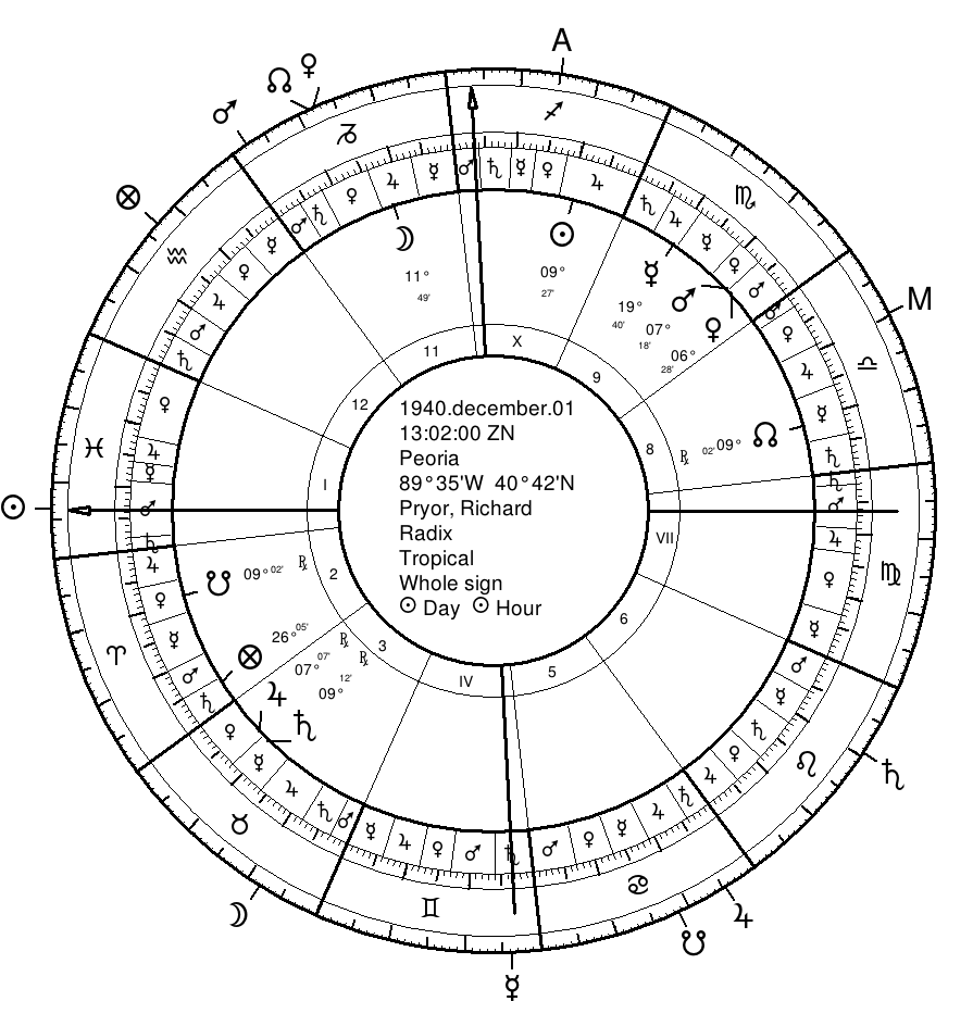 Richard Pryor’s chart (birth time AA-rated) has all three planets of actions in the 9th house, and none of them in phasis, stationing, or strongly advancing. Mercury most closely regards the Ascendant (23°44′ Pisces), while Mars rules the bounds of the Ascendant and MC. As I noted in the article on difficult cases with the professional significator, the twelfth-parts should be examined. In this case the twelfth-part of Mercury is conjunct an angle and in a stake, so Mercury is most relevant.