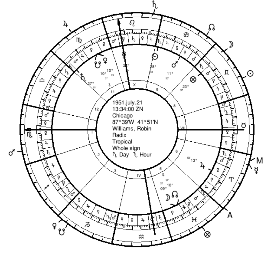 Robin Williams (birth info AA rated) was also born with the Mercury bound of Scorpio rising, like Carrey. Additonally, Robins had Mercury as the main career significator. Mercury was conjunct Williams MC in its own bound in X. One can certainly get a sense of that Mercury strongly advancing right on the MC in brilliant Leo, with its volume turned all the way up, from Williams’s comedy acts.