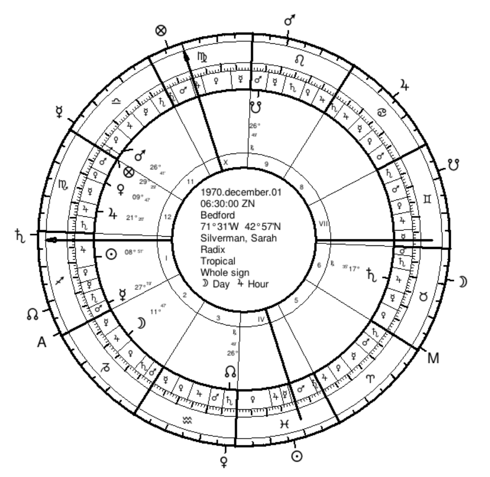 Sarah Silverman (birth time A-rated) was born with the Sun rising in the Jupiter bound of Sagittarius (house of Jupiter). Mercury is also in the 1st house and rules the 10th house. Therefore, Mercury is the main professional significator, though Mars (in XI; Jupiter’s Joy) is also relevant. Mercury is not only in the 1st house, but the twelfth-part of the Ascendant is closely conjunct Mercury. Therefore, there are strong Mercurial and Jupiterian themes pertaining to the 1st house and the Sun.
