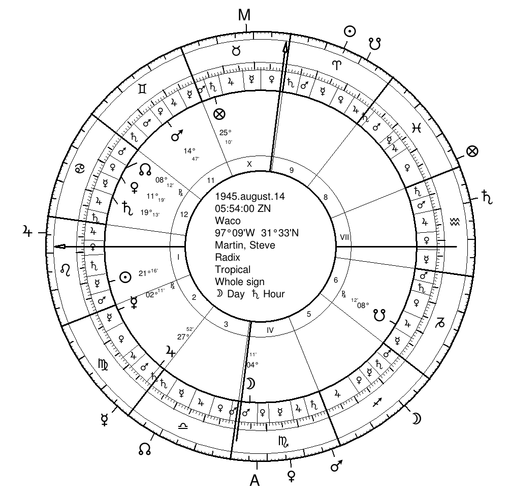 Steve Martin (birth time AA-rated) has both Mercury and Mars as professional significators. Mercury is relevant due to its advancing location in the 2nd with a close trine to the MC. Mars is relevant because it is in the 11th and advancing. Mercury is in its own bound and in its own house (Virgo) together with Jupiter. Mercury’s twelfth-part (at 26 Virgo) is very closely conjunct Jupiter. Mars, which dominates Mercury and Jupiter (right side square) is in XI (Jupiter’s Joy) in Mercury’s other house, Gemini.