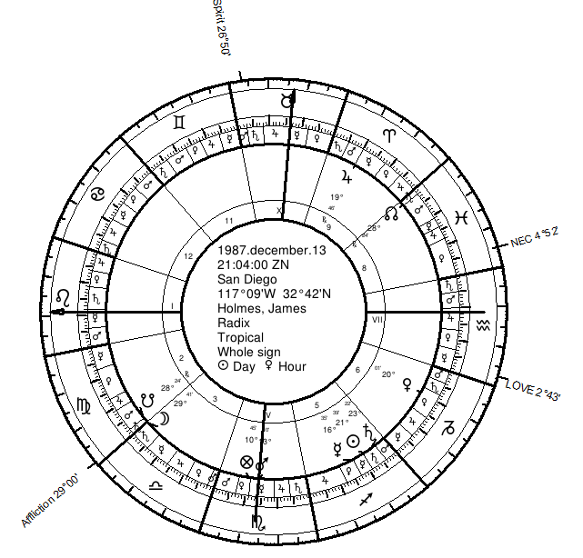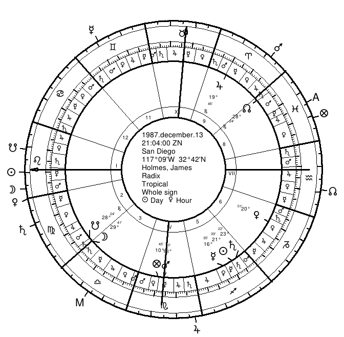 About a week ago, the birth certificate of the Colorado movie theater shooter, James Holmes, was unearthed and his birth time uncovered. In ancient astrology a valid birth time is essential to character analysis as it sets the rising degree which determines which topics are assigned to which signs (i.e. the houses of the chart). Now that we have a birth time for James Holmes, I would like to make a couple brief notes about the chart which reiterate some of the important points I’ve raised in past. I have previously explored the factors for character analysis and issues with the use of essential dignity. I’m also an advocate of the use of advancement in assessing planetary prominence. This will not be an in depth look at the events and will largely be devoid of timing techniques. I may delve into such topics at some future point.