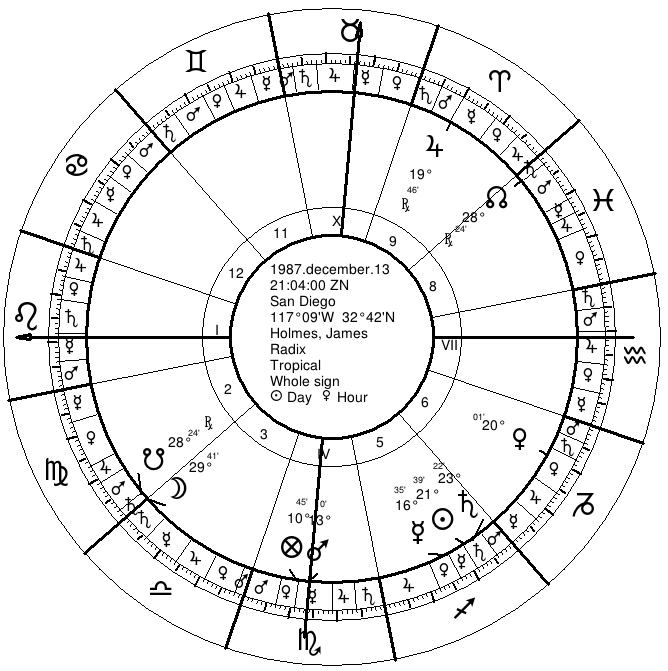 James Eagan Holmes was born on December 13th, 1987 at 9:04pm in La Jolla, California (source). His basic chart is shown below.