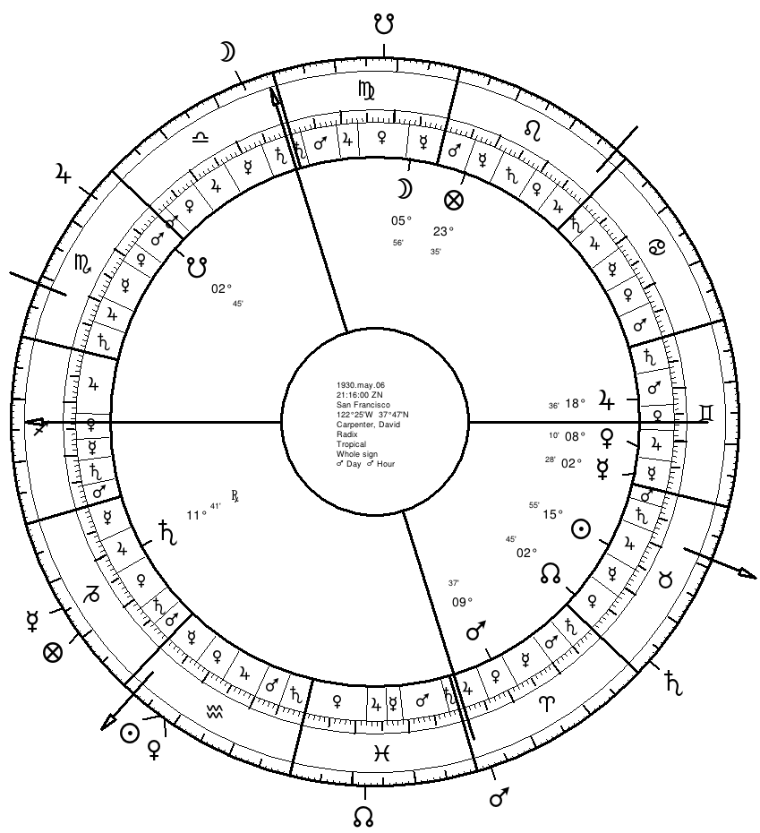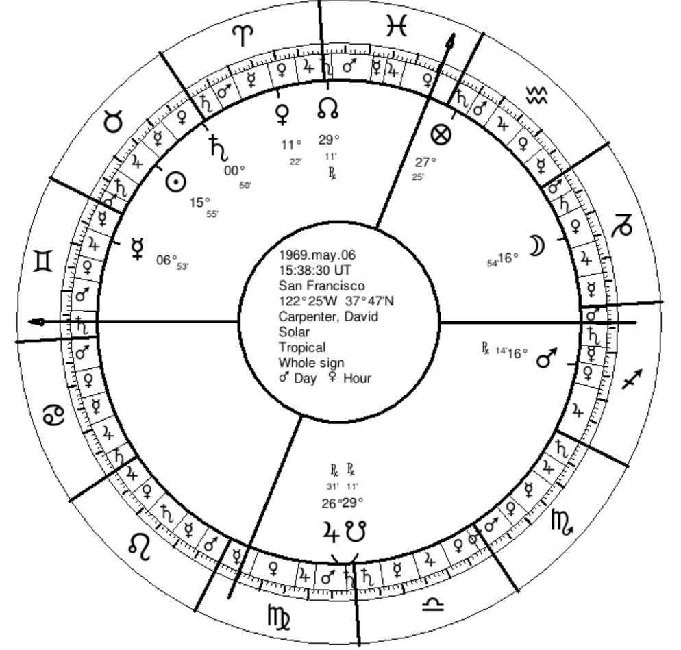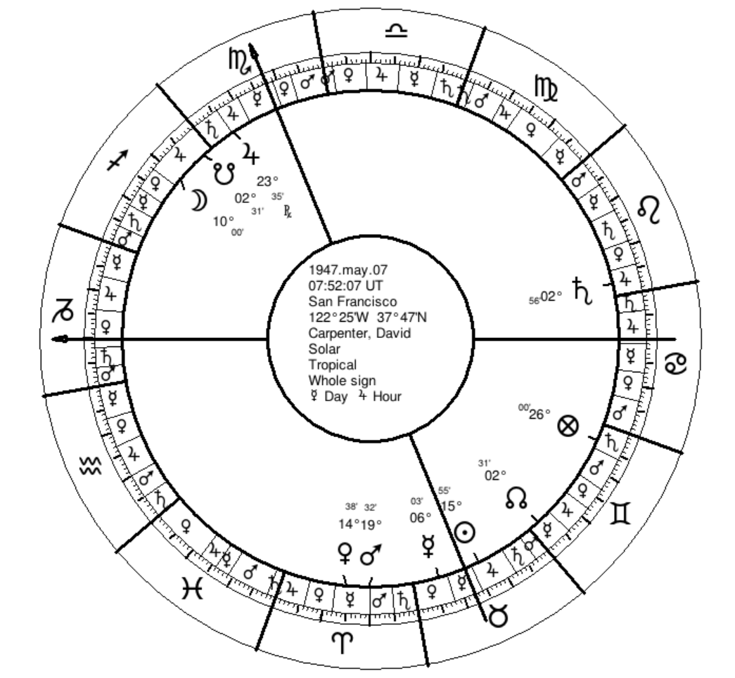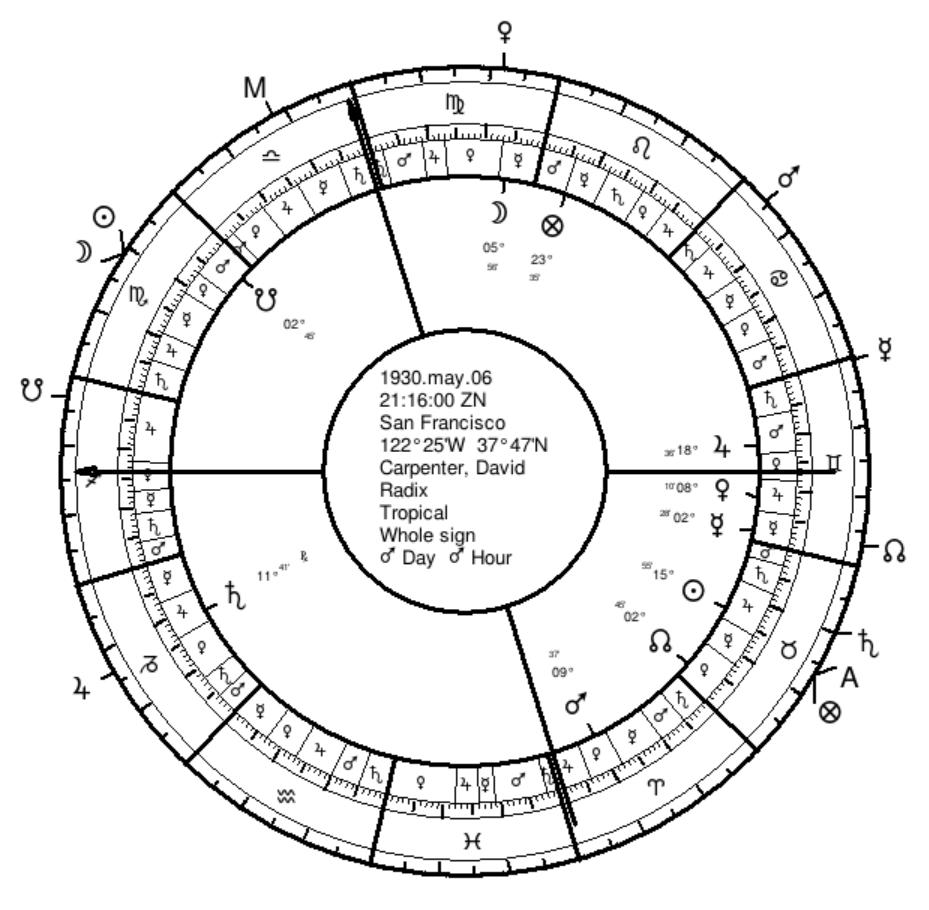 The chart of David Carpenter is interesting on a number of levels. I believe it is impossible to accurately see the key associations in this life without using the twelfth-parts, lots, and other such hidden factors. Additionally, we see the importance of detailed delineation in which things like possible stations, twelfth-parts, antiscia, and the lots are checked. In fact, it may be that much of the key information in every chart is actually less apparent. Such hidden information tends to be more individualized and to indicate things that are less superficial. By contrast, easily apparent indications like dignity by sign can easily lead one astray if misinterpreted.