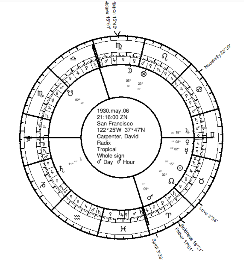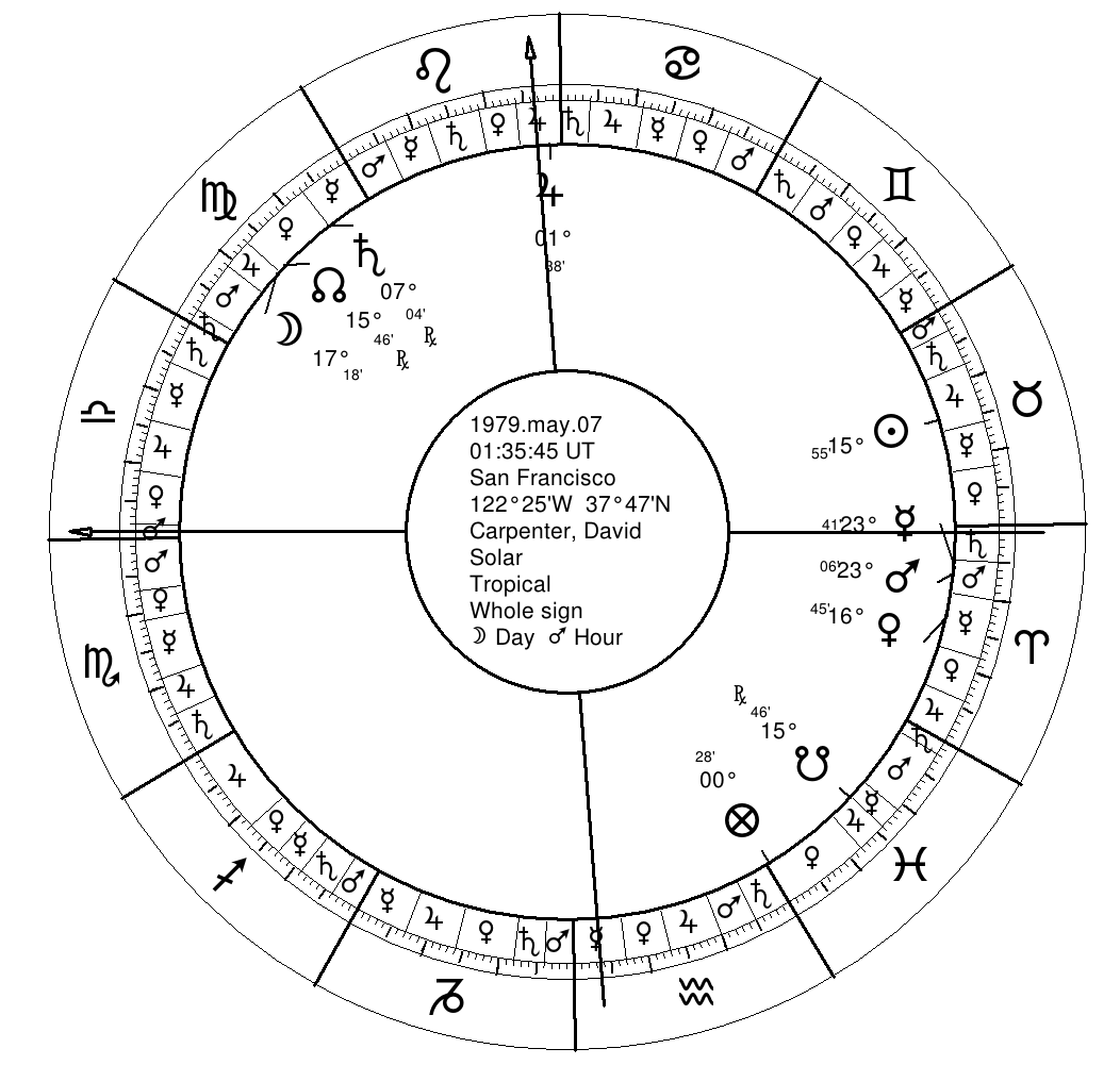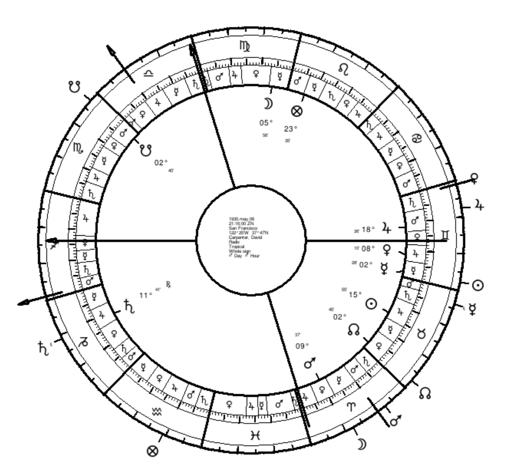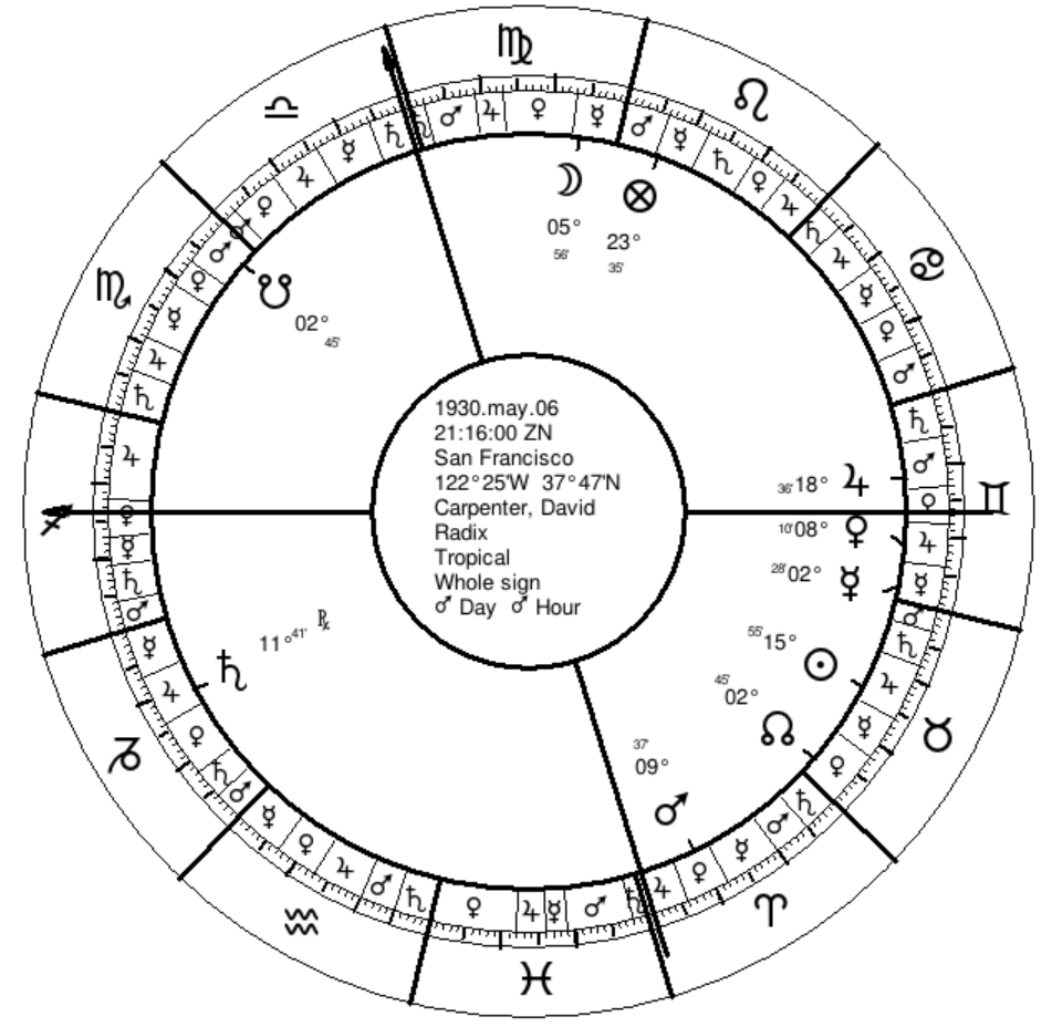 The chart of David Carpenter is interesting on a number of levels. I believe it is impossible to accurately see the key associations in this life without using the twelfth-parts, lots, and other such hidden factors. Additionally, we see the importance of detailed delineation in which things like possible stations, twelfth-parts, antiscia, and the lots are checked. In fact, it may be that much of the key information in every chart is actually less apparent. Such hidden information tends to be more individualized and to indicate things that are less superficial. By contrast, easily apparent indications like dignity by sign can easily lead one astray if misinterpreted.