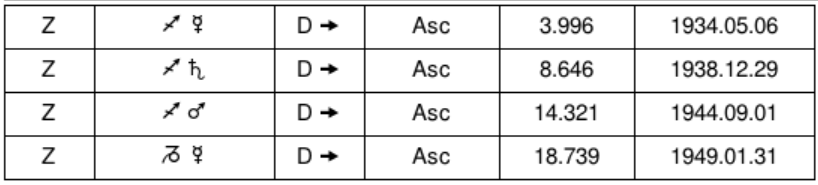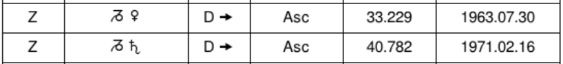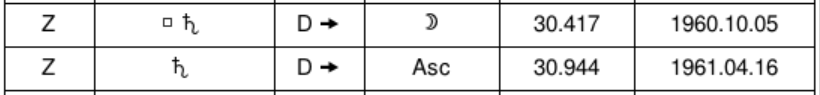 The antiscia chart also shows the mother linked with harm. The Moon and Mars are antiscia each other by sign. As already noted, the Saturn-Ascendant antiscia shows self-identification with the father.