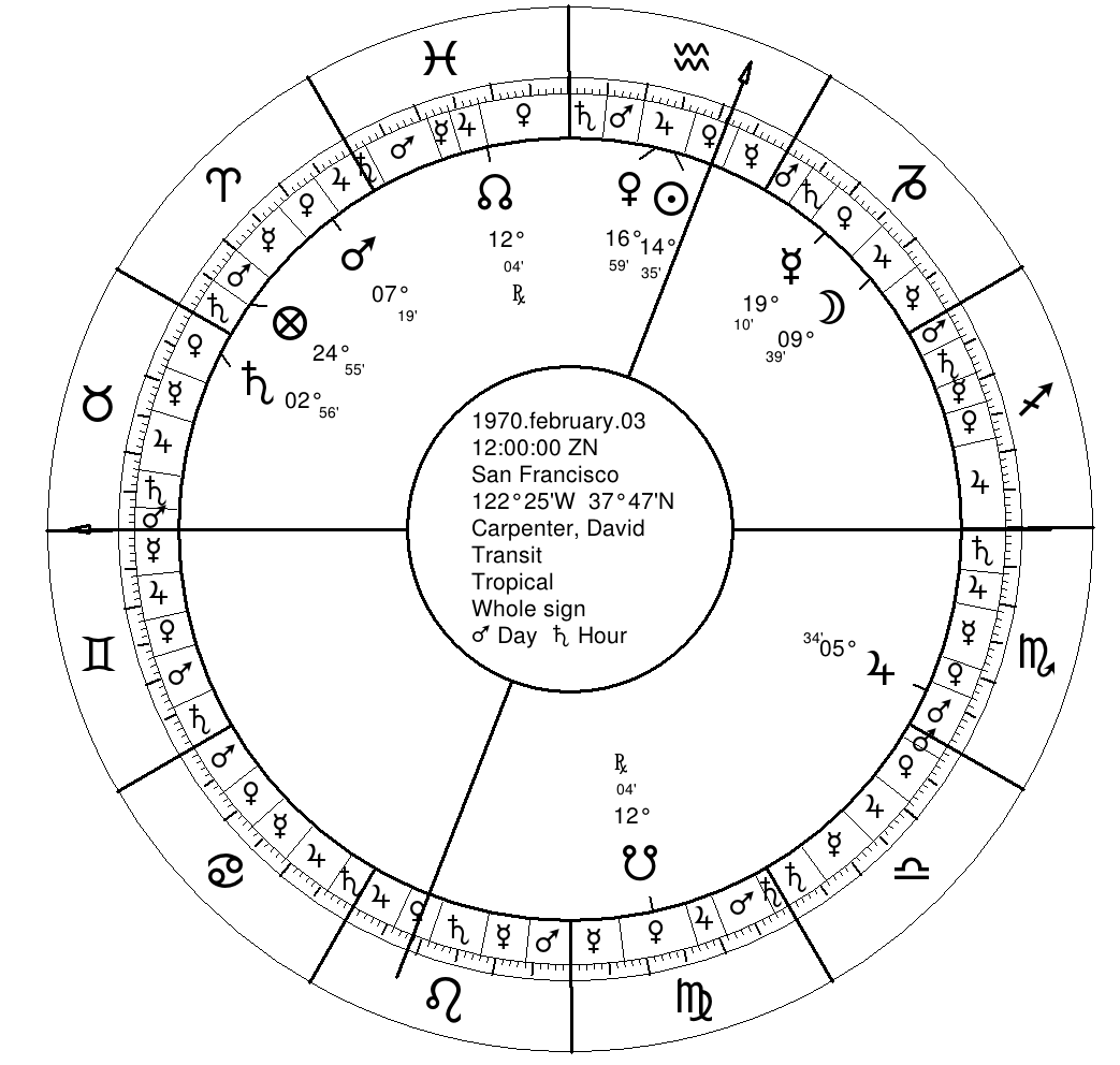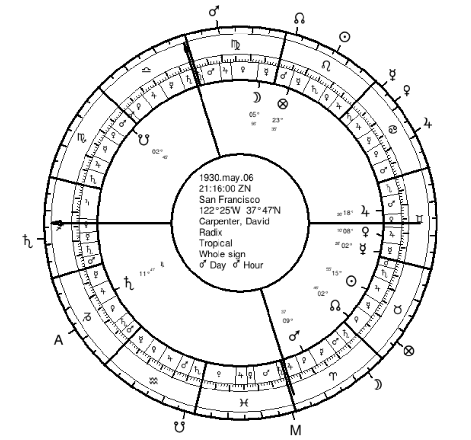 It is hard to look at Carpenter’s chart and not notice that he was born on the planetary day of Mars and at the planetary hour of Mars. Many Medieval astrologers included the rulers of the planetary day and hour as significant in their techniques for finding an overall chart lord. Vettius Valens also advised to look at the planetary day and hour rulers of the natal chart (see my article on planetary days and hours). We may consider this another indication of the importance of Mars in characterizing Carpenter’s life.