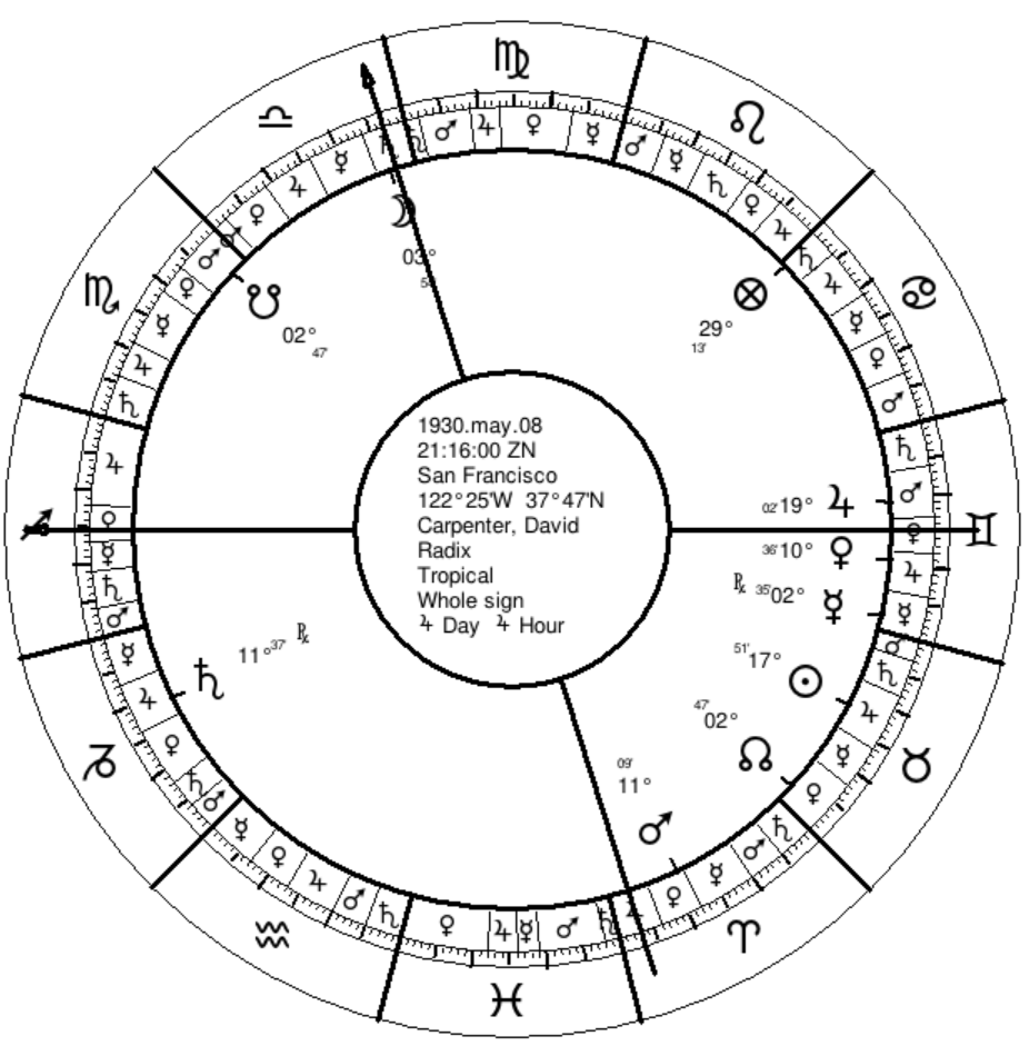 Obviously, we cannot get the full story on character from the apparent state of the Lord of the Ascendant and Mercury in the chart. For the most part they indicate positively. It is in fact troubling that they can apparently indicate positively for the most part but we can end up with someone like David Carpenter. We do see that the strongly advancing Mars is very loud in the life and influential upon the character, but there are plenty of missing pieces. Remember this before assuming that you can judge character based on the apparent state of a few factors that signify character.