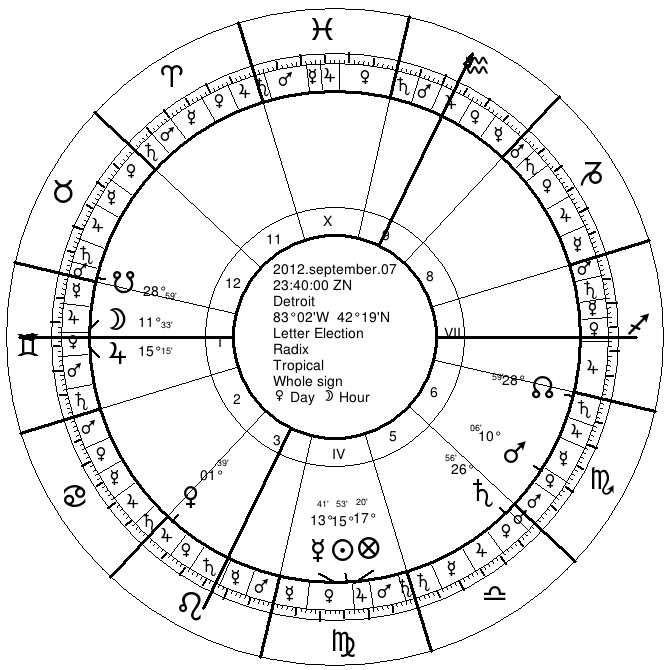 As far as input for our Mercurial elections goes, this is not extremely helpful. We do see that Mercury again is important though. Mercury is the central planet to consider whether one is on the transmitting or receiving end of a message. When looking at the event chart of the act of receiving it essentially becomes more of a matter of transit analysis. Benefic transits to natal Mercury and Mercury transits to natal benefics show good news. If these involve malefics then we have bad news. Also, we want to see if it is transiting benefics or malefics that are mostly influencing the Lights (Sun and Moon).