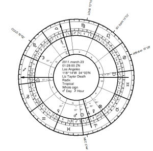 In Taylor’s case, the Moon pro­fects to Gemini, the 7th House, which is empty, so it is a case of the Moon trans­mit­ting to Mercury.  The 7th itself carries some significance for matters of death (place of setting). Mercury is in the 4th, which also carries such significations (place of anti-culmination, endings, and the earth).  Mercury is cazimi the Sun and is with Mars. While overall, the emphasis has been on the Moon, we see that Mercury may also have some special significance in terms of matters of the body. Mercury rules the Lot of Death and the prenatal syzygy, both of which are in Virgo.