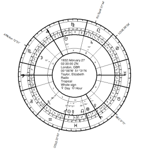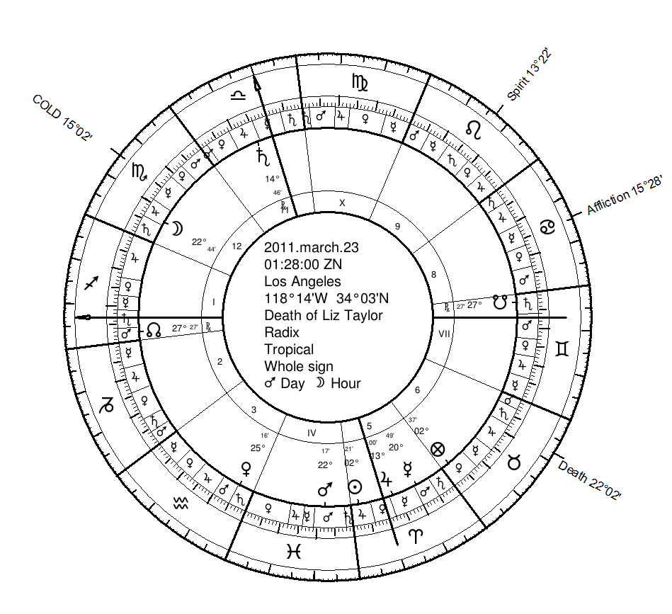 In this series, I have, so far, worked in broad and general strokes, looking at fundamental symbols of death in the chart. You will notice that I’ve ignored some of the more particular special techniques for longevity.  I will continue such a trend with this article on Elizabeth Taylor (analyzed by request of a reader). The approach follows along similar lines of analysis as my prior articles on the subject.