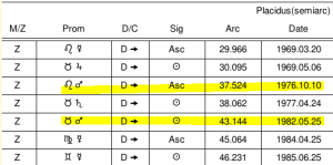 As the death happened just after the 45th year solar return, the annual profection of the Ascendant moved to the 10th place of the chart. Therefore, Aries was the sign of the annual profection at the time of death. The profection was highlighting the planets in the 10th place, including Saturn, Mercury, and the Sun. Mars, the ruler of Aries, was the lord of the year. In other words, the annual profection put the focus squarely on Saturn in Aries, ruled by and dominated by Mars.