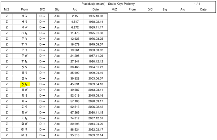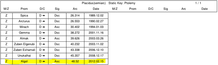 A table showing all the directions of fixed stars to the Ascendant from Age 25 to 50 is below.  The table says the direction was exact on February 15th, which in primary directions is still “exact” even on February 10th, because even seconds of inaccuracy in recording the birth time equates to days of difference in timing by primary directions.