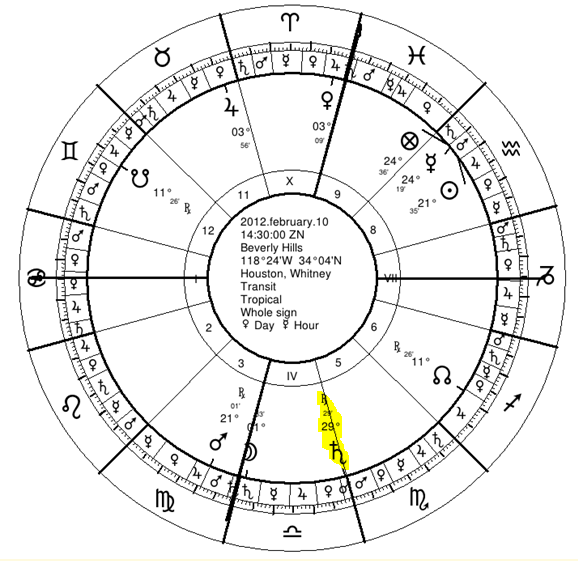 In the last article on Whitney Houston’s death, I discussed some major astrological predictive factors.  A number of predictive techniques highlighted the importance of Saturn. From the activation of her natal Sun-Saturn opposition, to Saturn’s transit through her 8th house of death.  At the time of death we found the transiting Sun conjunct her natal Saturn while the transiting Moon was in her 8th with natal Mars and applying to that transiting Saturn.  Altogether, 8th house and Sun-Saturn themes abound in the predictive indications. In fact, though not noted in the other article, Houston also has her twelfth-part Saturn in Virgo, the sign activated by the monthly profection at the time of her death.