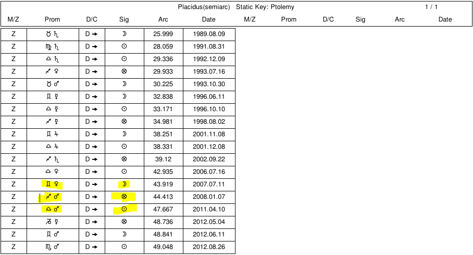 As we can see from the table above, Saturn is the main time lord of the period (day of death was Feb. 11, 2012). We find that this technique, as with many of the others, strikingly highlights the role of the natal 12th house Saturn in characterizing the period.