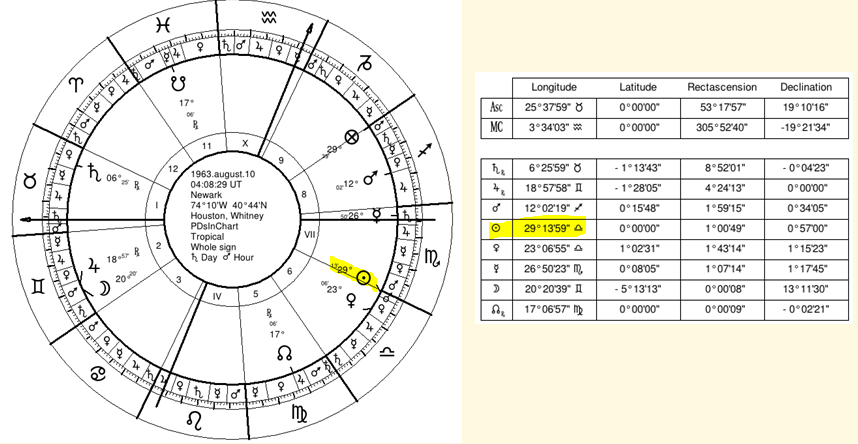 One of the more interesting directions at the time of death concerns the Sun. As seen above (2nd table up), the distributor of the directed Sun was in the Mars bound of Libra.  This bound is 2 degrees in length starting at 28° Libra and ending at 0° Scorpio.  Interestingly, Libra is Whitney Houston’s 8th House and the Mars bound of Libra is the bound Saturn transited at death.  In fact, look below at the chart of the primary directions zodiacal positions at the time of death. We find the directed Sun at about 29°14′ Libra. Transiting Saturn was conjunct it in the same degree at the time of death.