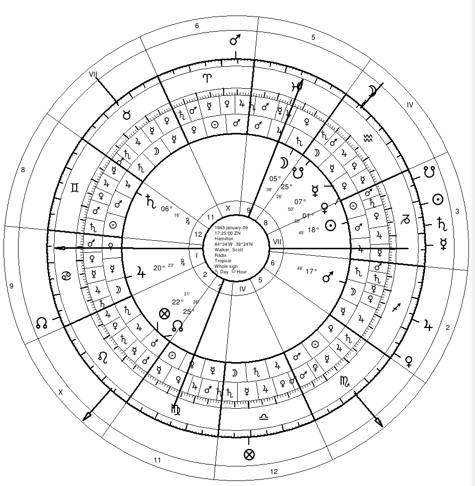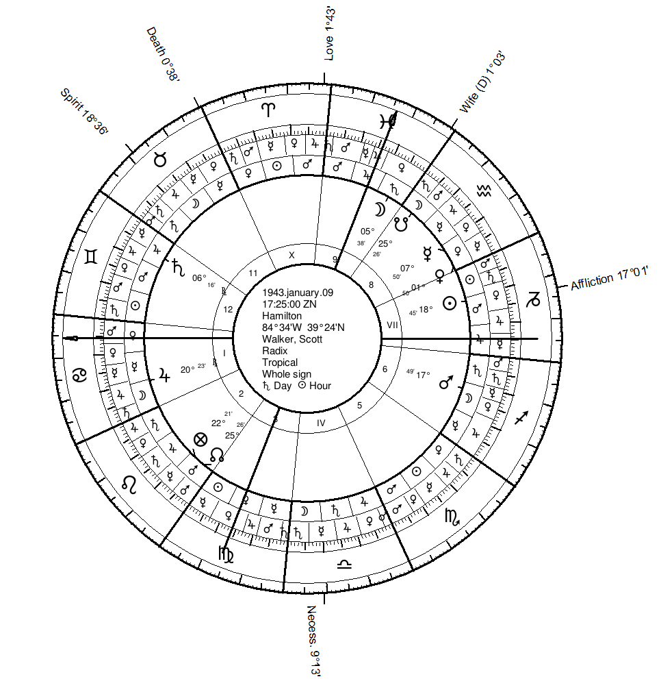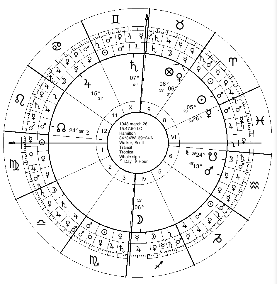 Walker died at age 76, in his 77th year, and just a couple months after his birthday. There are many planetary year combinations that pertain to the numbers 76 and 77. A few that stand out given our identified significators are Sun (19*4=76), Sun-Saturn-Venus (19+19+30+8=76), Saturn-Venus (30+30+8+8=76).