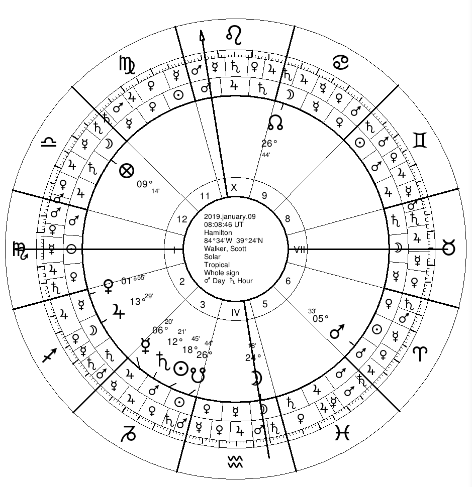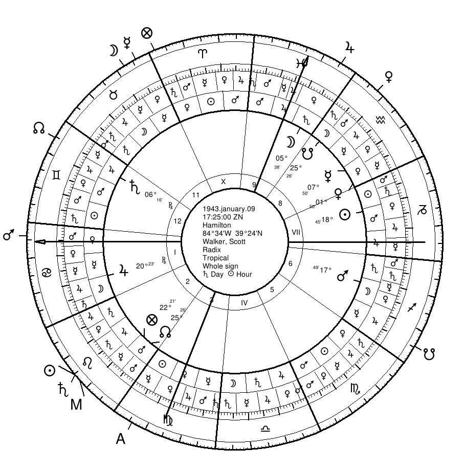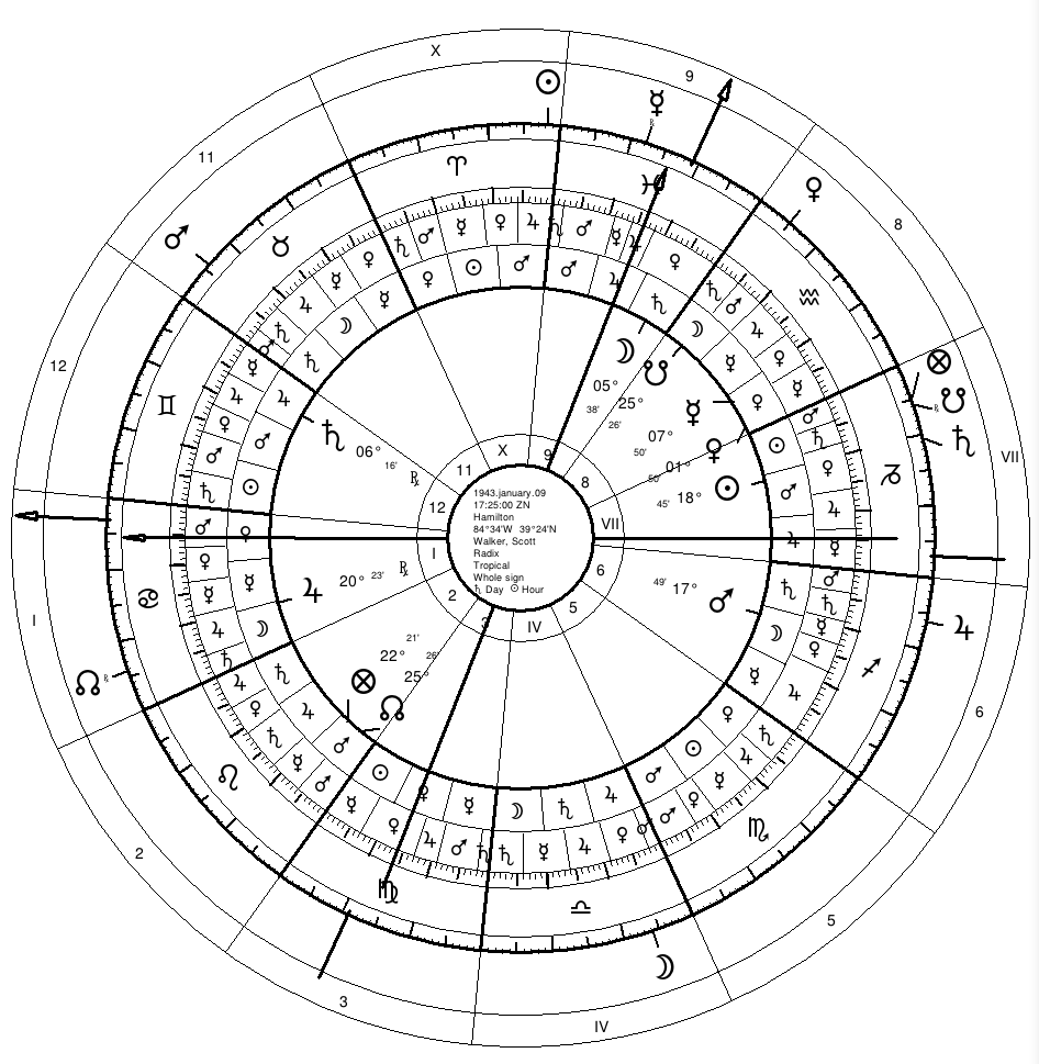 Scott Walker’s birth chart is below with the twelfth-part positions marked along the outside of the wheel. His birth data source gets a Rodden rating of AA (from birth record).