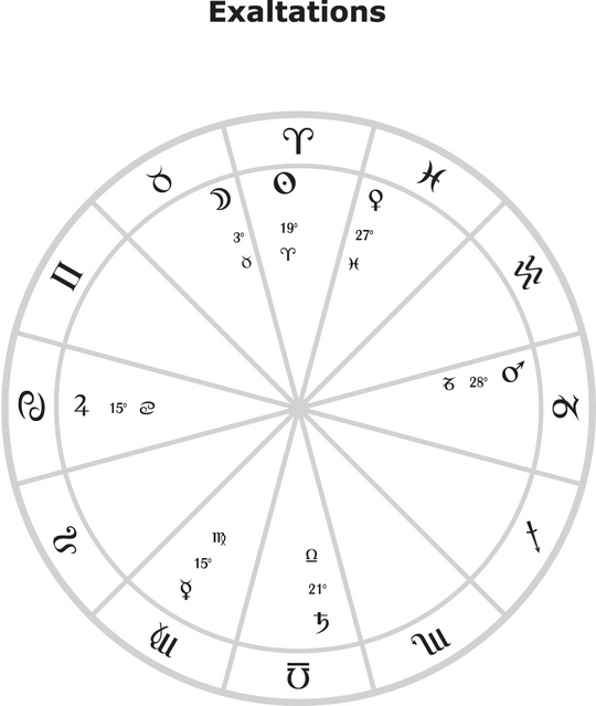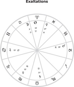 Each of the planets also has a sign that is said to be its exaltation or kingdom. The motivation for this is not as clear, but appears to also be based on tropical considerations. The exaltations center around the signs of the equinoxes and solstices. For instance, the Sun and Moon are associated with the signs of spring in the exaltations.