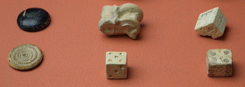 The image of various dice and game pieces from the Museo de Albacete, Spain by Enrique Íñiguez Rodríguez (Qoan) [CC BY-SA 4.0 ], from Wikimedia Commons