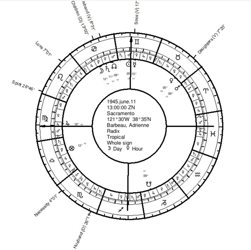 Adrienne Barbeau (AA-rated birth time) is an American actress, singer, and author. She was married to filmmaker John Carpenter in the early ’80’s with whom she had a son. She re-married, to Billy Van Zandt, later in life (at age 47) and gave birth to twin boys at age 51. I have included the Lots of Children from Dorotheus and Valens. I have also included the female marriage lots for those interested.
