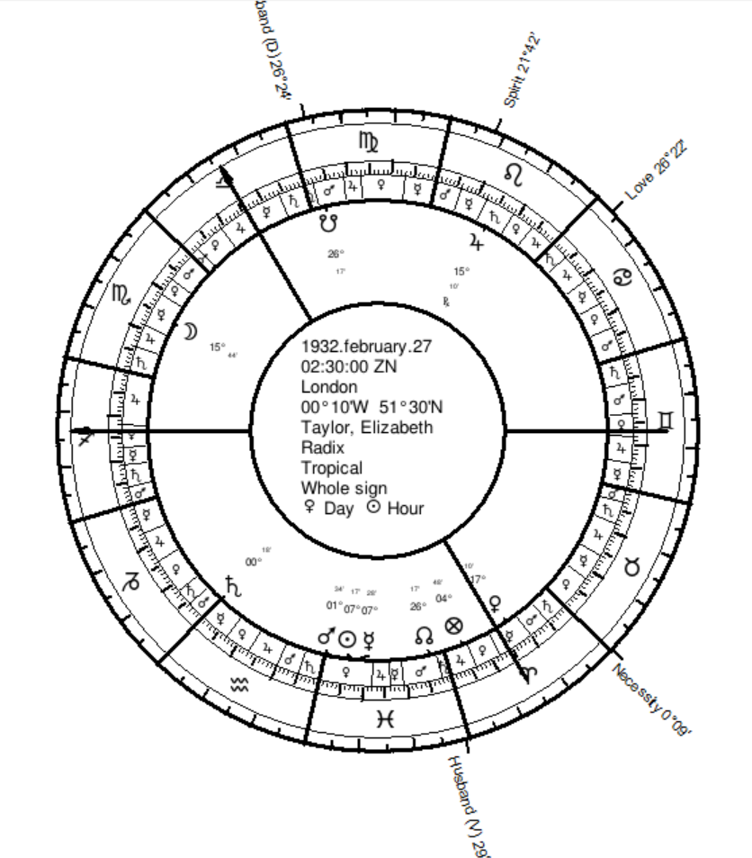 Also in Liz’s natal chart, the 7th sign from the ASC, the Venus-Saturn lot of marriage and Venus-Jupiter lot of marriage are all in dual signs! The 7th lord and lord of the Venus-Saturn lot is in 4th in a dual sign as well and is Cazimi and conj. Mars and North Node. Taken together, these configurations would suggest many marriages (dual signs involved, the 7th lord and lord of the lot Cazimi and occupying the same sign as another marriage lot and the North Node as well as Mercury being in a dual sign) and promiscuity (Mars) and adultery (7th lord plus Mars). Sun in that configuration makes it all public and with the 7th lord Cazimi everyone is talking about her relationships and marriages. Now if Dorotheus is correct that we don’t reverse the Venus-Saturn lot calculation, then it looks like the Venus-Jupiter lot is much more indicative of the relationships that Elizabeth Taylor had. However, I wonder if it does make sense to reverse the Lot – in which case Venus-Saturn lot would also be in Pisces.