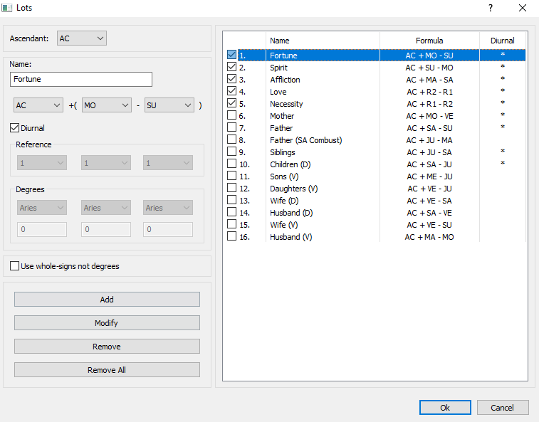 Software programs tend to use algebraic formulae for lots, which can be a bit confusing. The key to reading a formula like that is to work backwards. For instance, the formula “Asc + Moon – Sun” means take the distance from the Sun to the Moon and project it from the Ascendant. This is the day formula for Fortune.