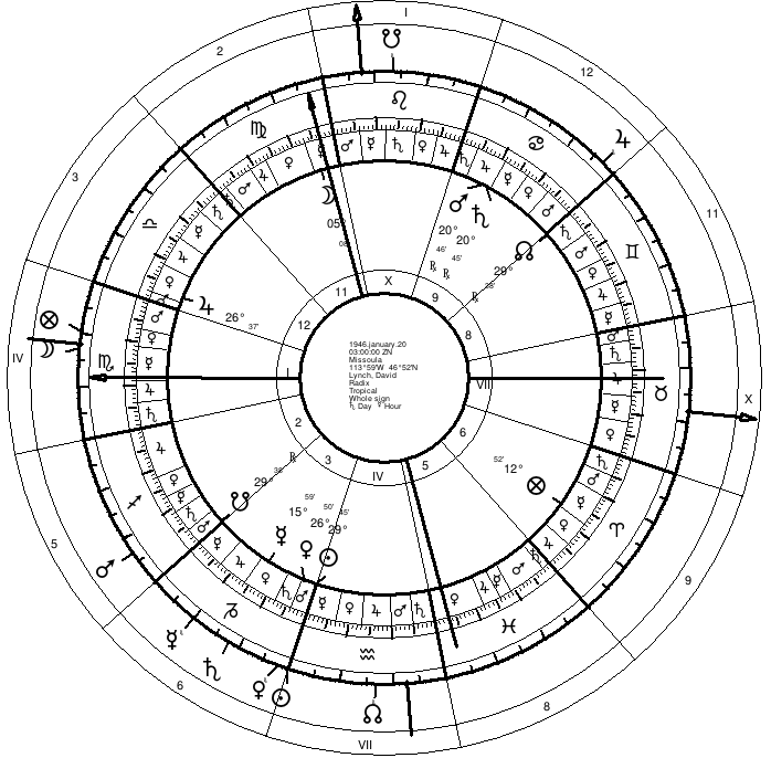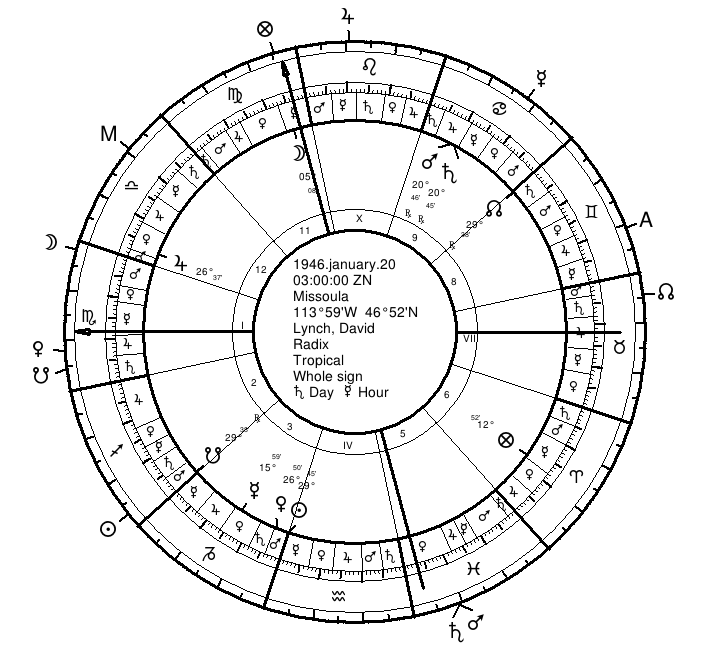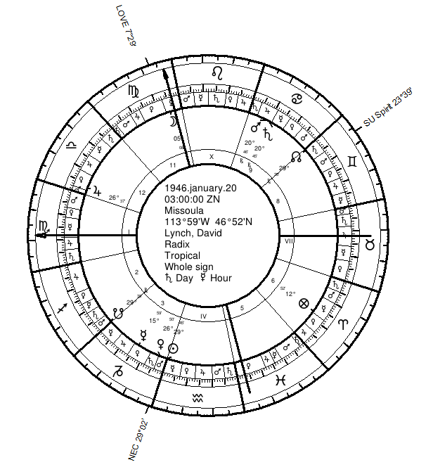 Venus is the primary planet pertaining to his aesthetic and it is fitting to find her dominated by subjective and spiritually-tinged maleficence (Mars and Saturn in the 9th, in the bound of Jupiter, ruled by the Moon) and irrationality (Venus in the Joy of the Moon, general pervasiveness of the Moon, Venus and Moon twelfth-parts co-present in the 1st of self and identity). The 3rd house journey/transportation themes also occur frequently in Lynch’s work. Wild At Heart, Lost Highway, and even The Straight Story are road movies, while main characters are often visiting outsiders.