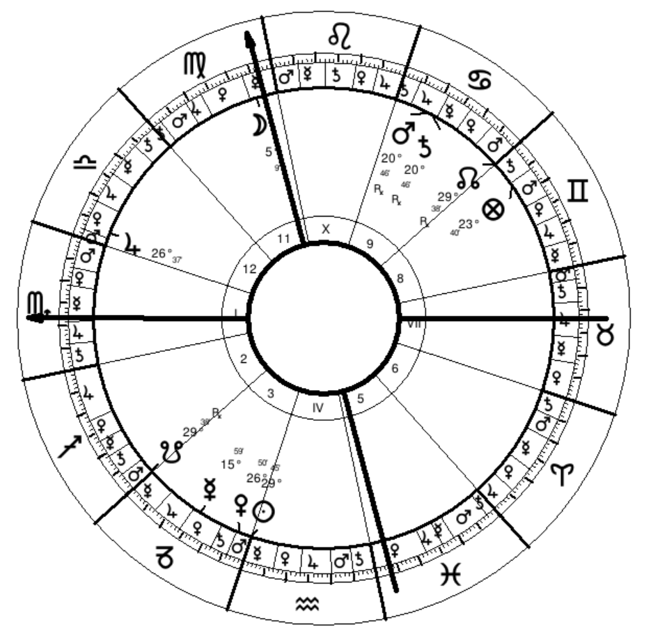 Fear-inducing (Saturn) and violent (Mars) spiritual entities (9th place) tended over by nature, night, and instinct (the Moon) are frequent themes in his work. The connection with art pertains to the fact that the malefics oppose and rule his Venus, the goddess of beauty and art. Venus is in the 3rd House, the Joy of the Moon, in the nocturnal house of Saturn (Capricorn), in the bound of Mars, and with the Moon as the primary triplicity lord. Her twelfth-part is in the 1st House, that of the self, in the nocturnal house of Mars (Scorpio), in the bound of Jupiter.