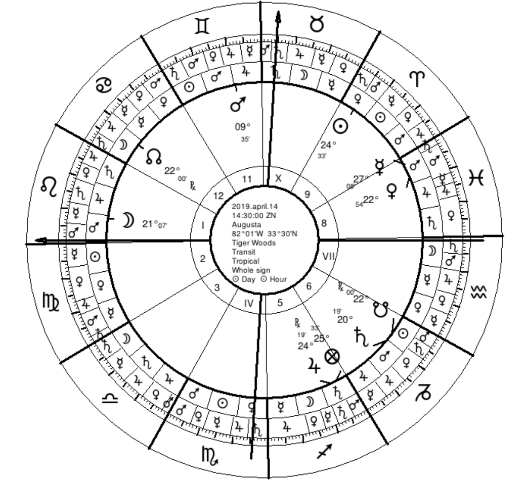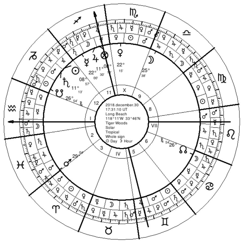 For me the most striking indications pertained to the grand fire trine and the Mars return. The fire trine involved the Lights and Jupiter, configured with Tiger’s own Moon and Jupiter. It indicates recognition and good fortune, setting off indications of such in Tiger’s natal chart and solar return. The Mars return in the 10th house highlights that this event is about Tiger coming back into his own in terms of professional performance.