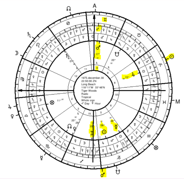 The rulers of the Ascendant show personal inclination and identification. The Mars bound of Virgo, nocturnal house of Mercury, was rising at birth. Therefore, we see a strong identification with the symbolism of Mars and Mercury in the chart. Tiger was even born on the day of Mars and the hour of Mercury.